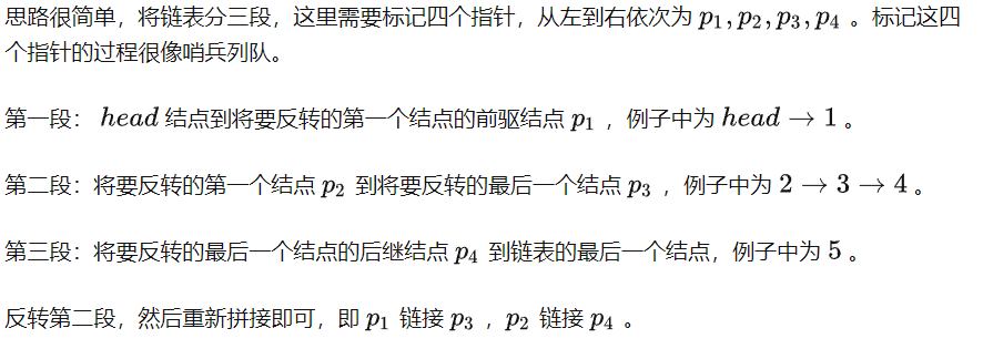 void reverseBetween(struct ListNode *head, int left, int right) { struct ListNode *p1 = head; for (int i = 0; i < left - 1; i++) { p1 = p1->next; } struct ListNode *p2 = p1->next; struct ListNode *p3 = p2; for (int i = 0; i < right - left; i++) { p3 = p3->next; } struct ListNode *p4 = p3->next;